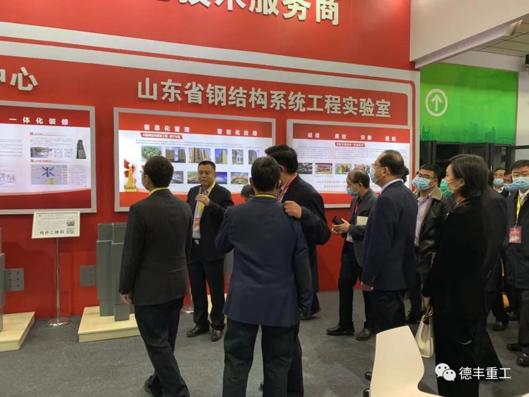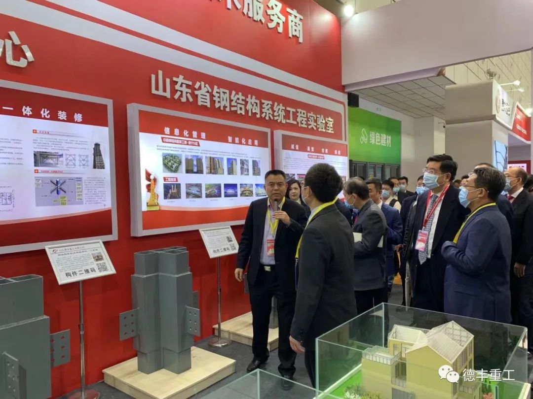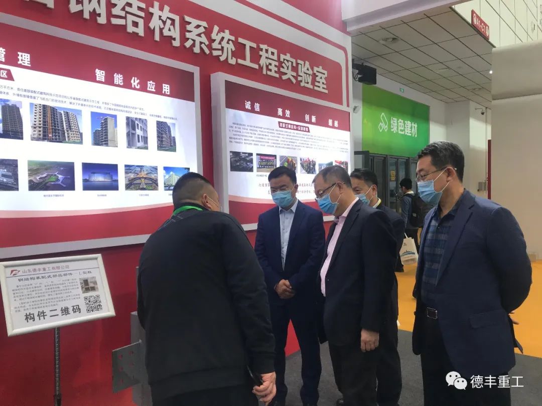 中國(guó)鋼結(jié)構(gòu)協(xié)會(huì)會(huì)長(zhǎng)岳清瑞院士、山東省住建廳二級(jí)巡視員殷濤參觀德豐重工展位。
